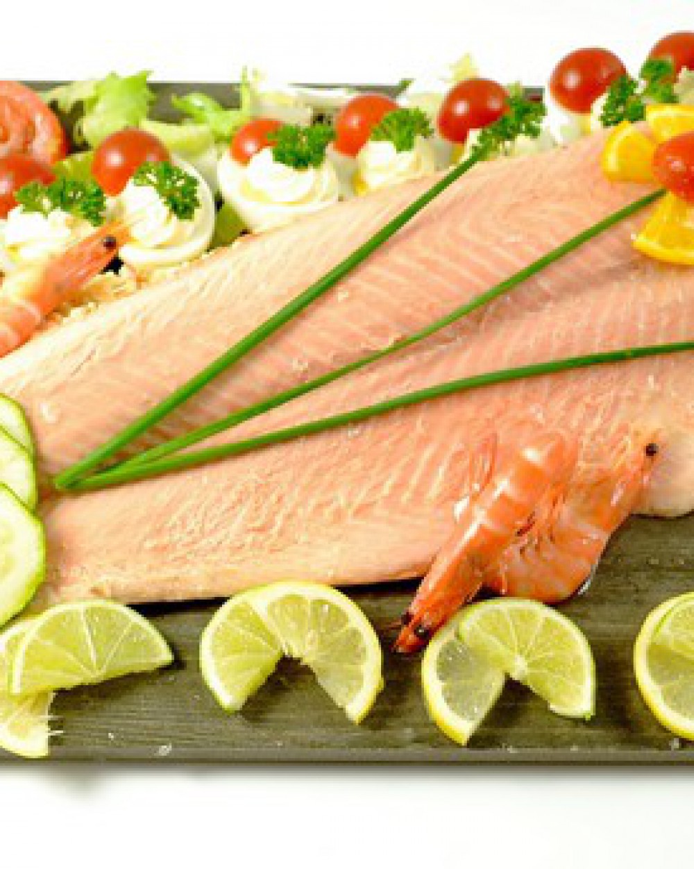 Saumon Bellevue sur lit de perles marines, œufs durs, tomates et crevettes bouquet
