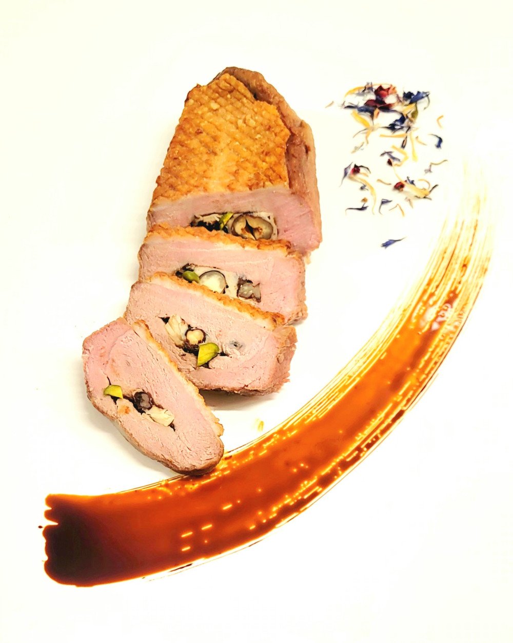 Filet de canette farcie d’un mendiant (pistache, abricot, noisette, amande pruneau) accompagné d’une poêlée de petit épeautre asperges et morilles, mousseline de panais et d’une sauce jus de veau