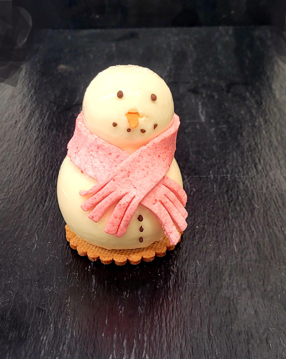 Confit cassis, crémeux fruits rouges, mousse bubble-gum, biscuit amande, le tout sur un sablé